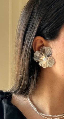 گوشواره زنانه گل کشیده مرواریدی مینیمال دخترانه رنگ نقره ای