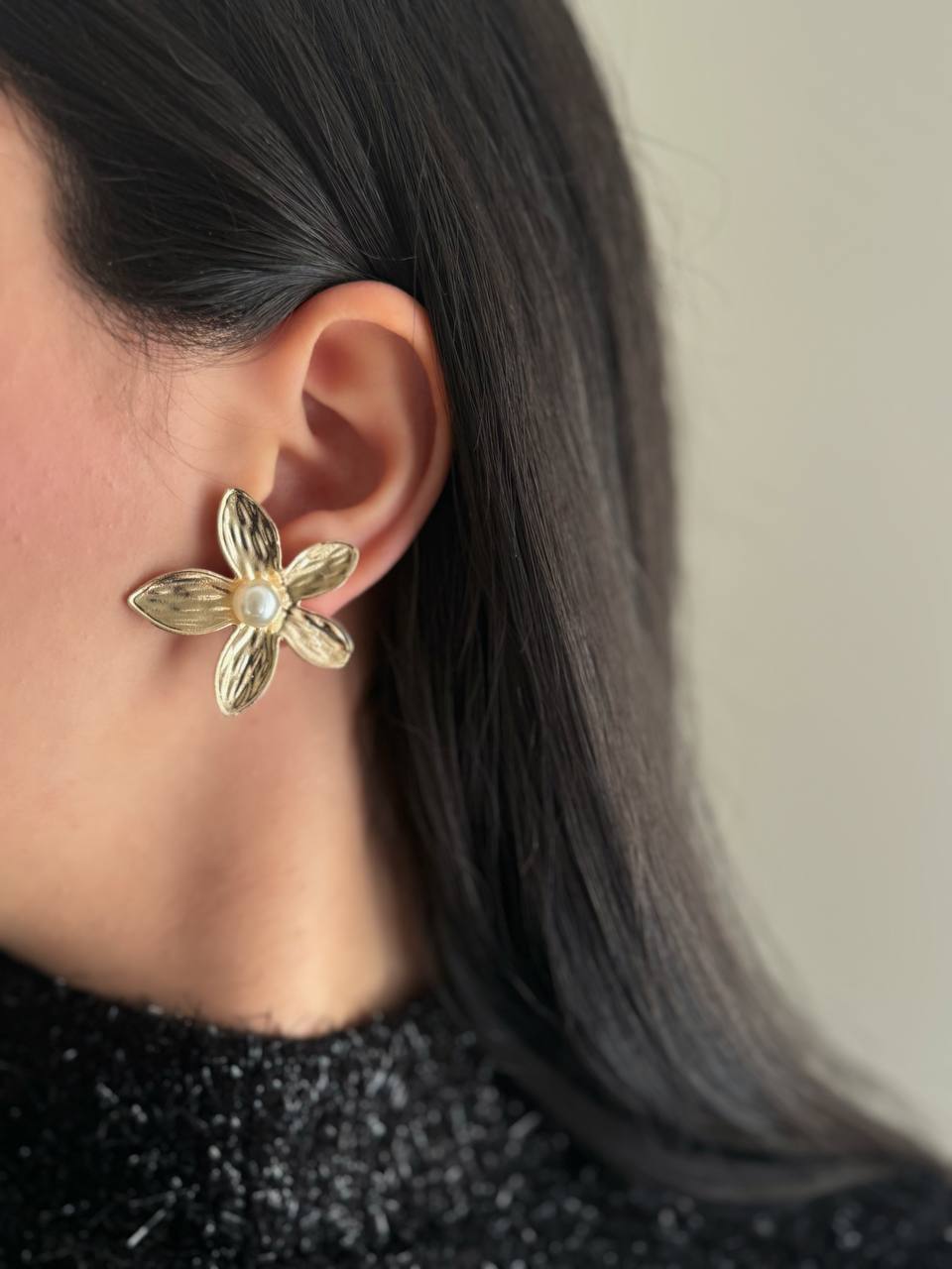 گوشواره زنانه گل کشیده مرواریدی مینیمال دخترانه رنگ طلایی