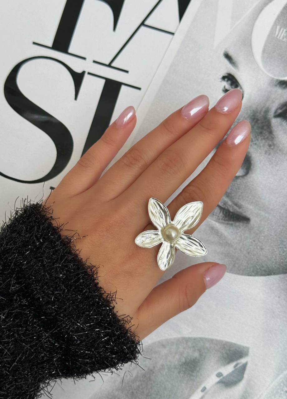 انگشتر زنانه گل کشیده مرواریدی مینیمال دخترانه رنگ نقره ای