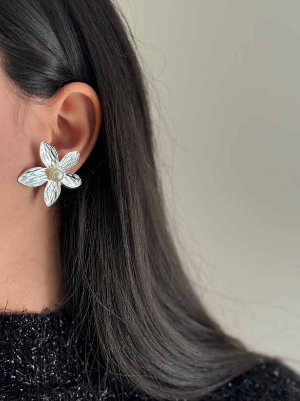 گوشواره زنانه گل کشیده مرواریدی مینیمال دخترانه رنگ نقره ای