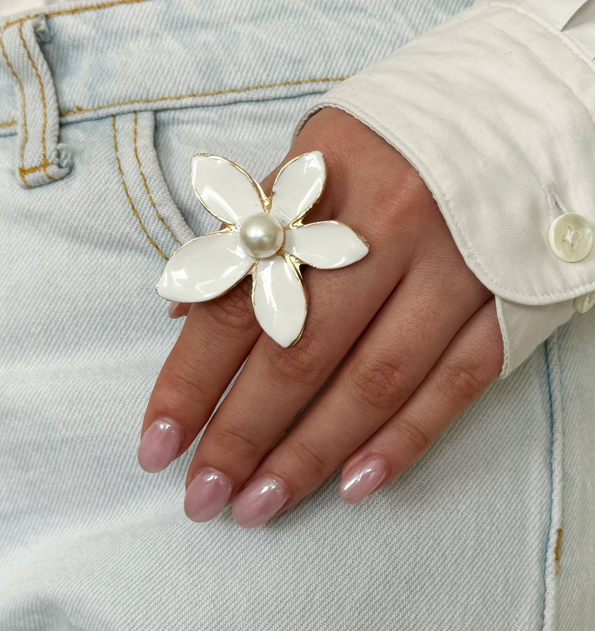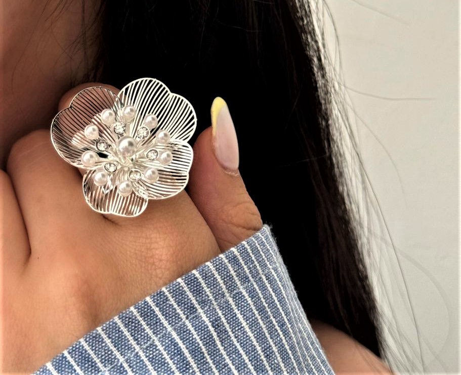 انگشتر زنانه گل کشیده مرواریدی مینیمال دخترانه رنگ نقره ای